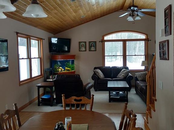 This custom 3 BR 3.5 BA home offers a prime location with over 40 acres of gently rolling, wooded property with trails, and 500+/- feet of meandering frontage on Lake Three, which has no public access. This location offers ATV/snowmobile trail access and is an easy walk to the Lake Ten boat launch/beach. The home has an open feel, Great Room with cathedral tongue and groove ceiling, oak cabinets, 6 panel doors, and a lower level family room and full bath, great for entertaining and/or guests. The upper master suite is spacious, with walk in closet and full bath, and the upper landing doubles as a reading nook/library. There is an attached garage and detached 28 x 36 garage on a slab, plumbed for heat. This lot is landscaped and has sliding doors from the dining area to the rear deck with hot tub! This property is a one of a kind find. Call for details!