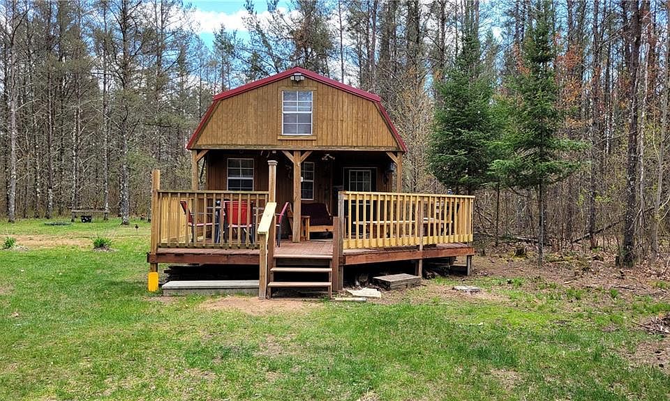 Inviting, homey cabin on 4.87 wooded acres with plenty of wildlife. All the comforts here; full kitchen, 3/4 bath, main floor bedroom with 2 sleeping lofts. The wrap around deck is partially covered and the firepit with picnic areas give relaxation space for all. Drilled well and conventional septic, also 2 RV/EV hookups and access for dumping camper waste. Add to this the mature pine woods with hardwood saplings and an open field/food plot area. Furnishings are included with a few exceptions. Acres of county hunting land, trout stream and lakes nearby, and good proximity to Spooner, Stone Lake and Hayward. Time for your very own up north retreat at a reasonable price!
