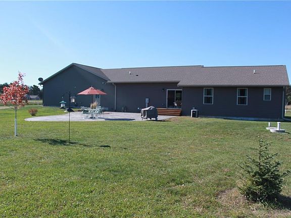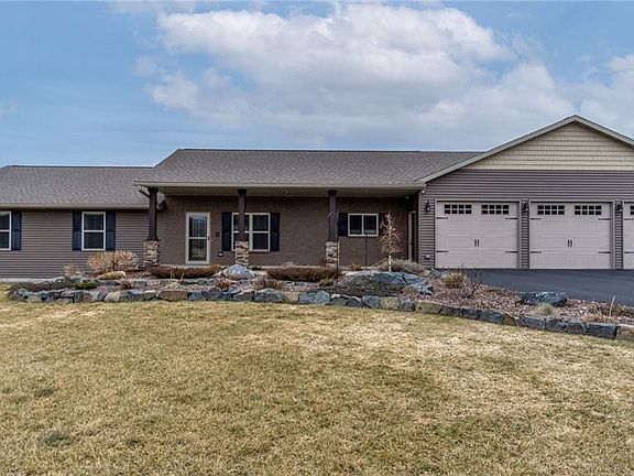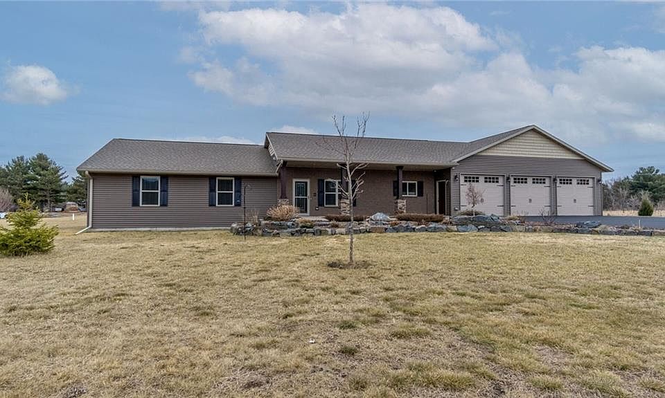 Over 2 acre lot close to Tainter Lake! This zero entry home is located in the desirable Cedar Falls area. House features an open KT/DR/LR, 10 foot ceilings, stainless kitchen appliances, 3 bedrooms on main level and main floor laundry! Kitchen includes large walk-in pantry, gas stove, quartz countertops and tiled backsplash. Owner's suite has walk-in closet, private bath with 2 sinks, soaking tub, and tiled shower. Large back entry. Steps from att 3 car garage directly to basement. Basement plumbed for 4th bath and has egress window for 4th bedroom! Finish to your liking! Quiet neighborhood! Detached heated 28 x 28 garage is wired for surround sound. Beautifully landscaped yard!