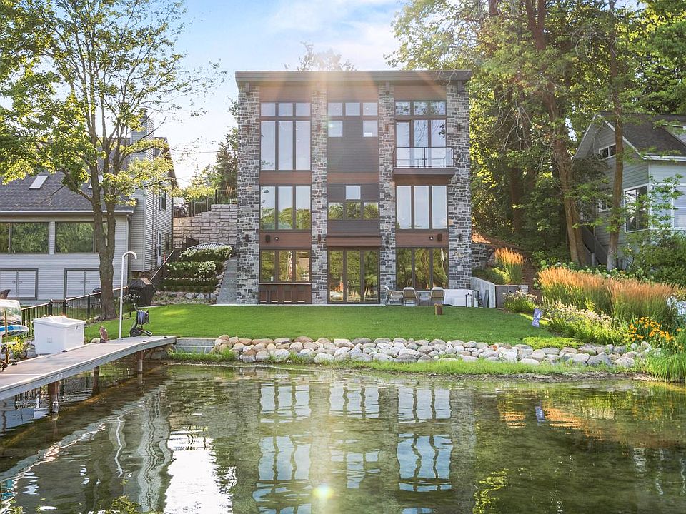 Experience luxury & breathtaking views on the shores of Crystal Lake. This stunning 4BR 2.5BA home is an architectural & design masterpiece, featuring white oak ceilings/floors, Bunk Rm, smart home tech, 2 laundry Rms, floor to ceiling wall of doors opens just off the chef's kitchen, blending indoor & outdoor entertaining spaces with integral firepit & outdoor bar seating. Thoughtfully landscaped with irrigation & granite steps, hot tub, private pier with hot shower, whole house security system, and high-end finishes throughout. This is your ultimate retreat, just turn the key and start living. Every detail is crafted for relaxation, beauty, & convenience, just minutes from Road American, Elkhart Lake Village, & Whistling Straits. See Documents for an extensive list of special features!