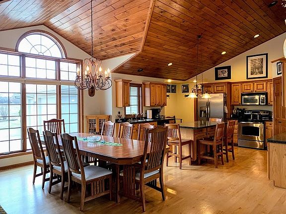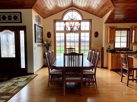 This home gives elegance a new definition! As you journey through this tranquil sanctuary with an amazing layout & acreage you will want this house to be your home! Enjoy sitting on your back stamped concrete patio enjoying your morning coffee watching the sunrise, entertaining your guests or watching the sunset as the day comes to an end on this beautiful 5 plus acre parcel. This home features a California split design with 3 bedrooms, 3.5 baths. The views of the living room are spectacular with incredible natural light, knotty pine vaulted ceilings, gas fireplace and an open concept to the dining room and kitchen. Gourmet kitchen offers beautiful hardwood floors, vaulted ceilings, stainless steel appliances, large pantry, separate island eating area and lots of counter space. Spacious laundry room is conveniently located off the kitchen with closet, half bath and separate access door. Right off the living room is a large master suite with walk in closets, separate shower and sink area as well as a whirlpool tub.