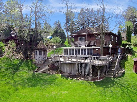 Sweeping lawns and fantastic lake vistas draw you to the water from this 4BR, 2BA lake home perfect for family and friends to enjoy. 2 fireplaces, lakeside sunroom and large deck with gazebo for relaxing and watching the world go by. Large garden shed and loads of parking in a private setting. New roof too!