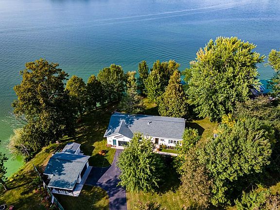 Incredible views...Home is nestled on a point, 300 feet of frontage on lower Tainter, very private and lightly wooded lot w/additional detached garage, several sheds. Home features magnificent views of the lake and manicured grounds. One level living, spacious kitchen w/pantry, great room w/gas fireplace, 2 bedrooms and 2 full baths, 4 season room leading out to back hot tub area, oversized attached garage (insulated and heated) great place for when the grandkids spend the night or spotless space for your vehicle. Truly one of a kind property!!