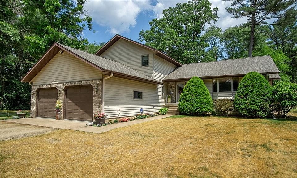 LOCATION..LOCATION..LOCATION best describes this 3.18 acre Park like setting just across the street from Tainter Lake. Grab your boat and in a minute you are docking it at Kleist Landing. Beautiful private backyard enjoy watching the abundance of nature, walking trails and fire pit area or enjoy a cup of coffee on your 16x12 deck. This lovely home has been updated through out, from kitchen with Stainless appliances, to newly updated bathrooms, flooring in entry, kitchen back hallway and laundry/bath. Newer 6 panel solid oak doors on main level, Love to entertain this wonderful kitchen with eating area open to your sunken Family Room. The Lower level has additional family/rec room, mechanical and great storage. Plus a New roof, Gutters, down spouts gutter guards. How about your 36x24 Shop, 20 x12 Utility shed and 20x12 Tarp shed, new garage Polymer coating, New upgraded Water Softener & Pressure Tank. 14 month Home Warranty, Pre-Inspected, Pride in Ownership best describes this home!