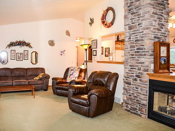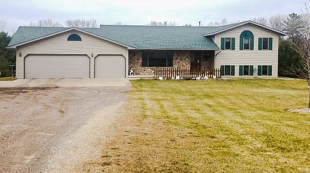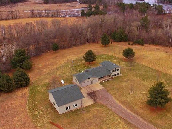 Enjoy everything that this wonderful property has to offer! 3 BD 3 BA home with walk-in closet in each room. Large open concept living room and kitchen with vaulted ceilings and fireplace inbetween. Great space for entertaining! Walkout basement with fenced in patio area. Great deck over looking yard where the turkeys and deer frequent it. 25+ acres of great turkey, deer and duck hunting. 800 ft of water frontage on Iola lake. Large pole shed with space for RV and all your toys!