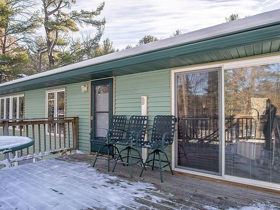 Welcome to Tainter Lake...Step inside and be impressed in this adorable lake home that has been updated throughout both levels. Fantastic entertaining kitchen with quartz Center island with cook top and fan and gather around the island seating at least 7. Custom cabinets 18" uppers with deep 30" lowers for amazing storage. New drywall, insulation most windows and doors on the main level with large windows overlooking your gorgeous back yard full of perennials of 100's of hosta, grapes, asparagus, rhubarb and strawberries and a planter box to plant your favorites. Rare find LOW elevation to the water, dock and new Gazebo with brick patio. Lower level has a brand new bath, bedroom and also get that cabin feel in the family room with resting area with wood burning stove. This is a must see, you will be amazed the minute you enter...JUST MOVE RIGHT IN!