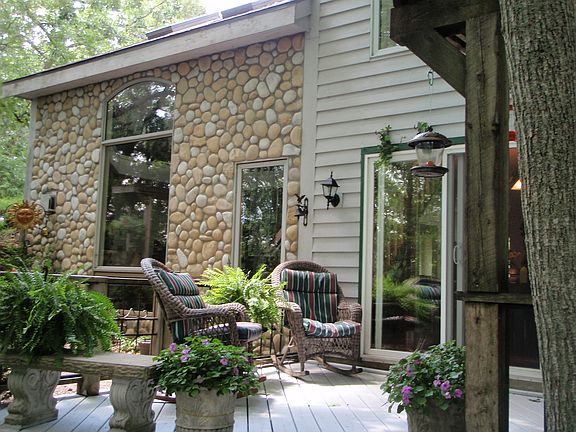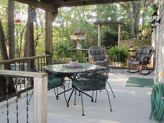 Lake Views without the high taxes! 3 Bedroom with guest quarters/apartment or 4th BR contemporary home w/stunning views of Pleasant Lake. Abutting private beach for town residents only! 1st floor features floor to ceiling NFP, an open layout for entertaining and 2nd BR. Upper level includes MBR with attached spa room, 4 season rm, and 3rd BR. There is a bonus rm with kitchenette & closet that can be used as guest quarters/apartment or a 4th BR that adjoins to 4 season room or you can enter with private entrance. Relax on 500 sq.ft. tri-level deck with view of woods, lake and private beach.