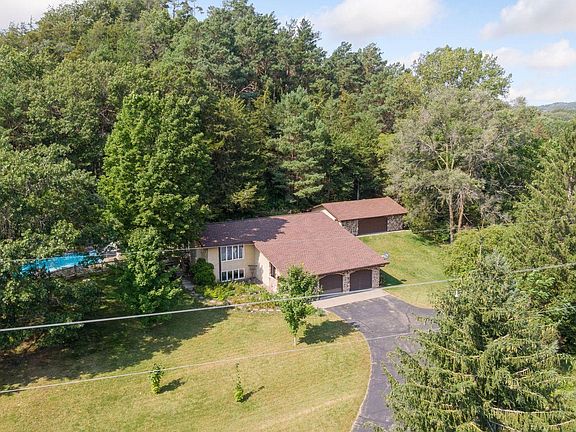 Ready to fall in love with your next home? This inviting 3-bedroom, 3-bath gem in River Falls sits on just over 2 acres of gorgeous green space and mature woods. Packed with charm, comfort, and a peaceful natural setting, you will enjoy the privacy this home affords. Step inside to a spacious main-level living room, highlighted by a large picture window that floods the space with natural light and a stone-accented gas fireplace that adds warmth and charm. The informal dining area seamlessly connects to the outdoor living space, creating an ideal setup for summer gatherings and everyday relaxation. Love to cook or entertain? You’ll appreciate the chef-style kitchen with paneled cabinetry, lots of counter space, and a peninsula that’s great for prepping, serving, or just hanging out. The primary suite is your personal escape, with a walk-in closet and a private ¾ bath featuring a walk-in shower. Another bedroom and a full bath round out the main level. Downstairs, the lower-level impresses with a large great room anchored by a stunning stone woodburning fireplace, custom built-in cabinetry, and warm finishes, ideal for cozy evenings or hosting guests. You'll also find a private bedroom, full bath, and laundry room. Step outside and enjoy your own resort-style retreat: an inground pool with diving board, refreshing outdoor shower, multiple patio spaces for entertaining, and a grilling area ideal for summer cookouts. The welcoming front patio sets the tone for peaceful mornings and sunrise views. An attached two-car garage is more than just parking, it features a cedar-lined closet, workbench, and ample storage, while the detached garage provides space for hobbies, equipment, or your gardening needs. Surrounded by mature trees and manicured landscaping, this home is a rare blend of privacy, convenience, and outdoor enjoyment. Located just minutes from local parks, schools, and River Falls’ vibrant downtown area, this property offers the best of small-town living with easy access to modern amenities. The home inspection has been completed for you. See supplements for photos, tour, Matterport Floorplan, and more.