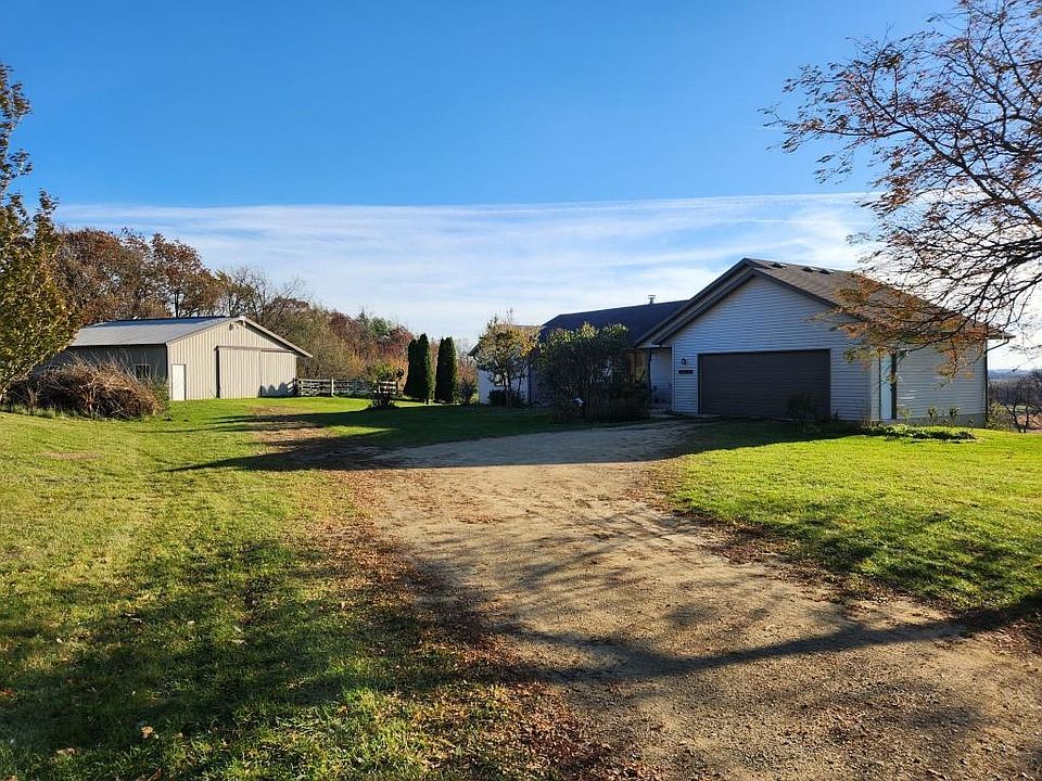 Located down a WI Rustic Road, you will find a charming 4+ acre property that offers privacy and stunning views! The Ranch home offers wonderful sunlight throughout! Impressive Living room w/vaulted ceiling, 3 sided fireplace, large windows, open area and wood floors. Bright kitchen w/dining nook that leads out to the backyard deck. Walkout lower level has 2 bedrooms, full bath, utility/storage area. You could potentially add a family room if desired. Outside enjoy multiple pastures for rotational grazing, 36x36 Cleary outbuilding with horse stalls, tack room and extra area for utility storage. Outbuilding also has running water and electricity. Walking trails throughout the land. You will be impressed with this setting. Home warranty included. New Glarus Schools.