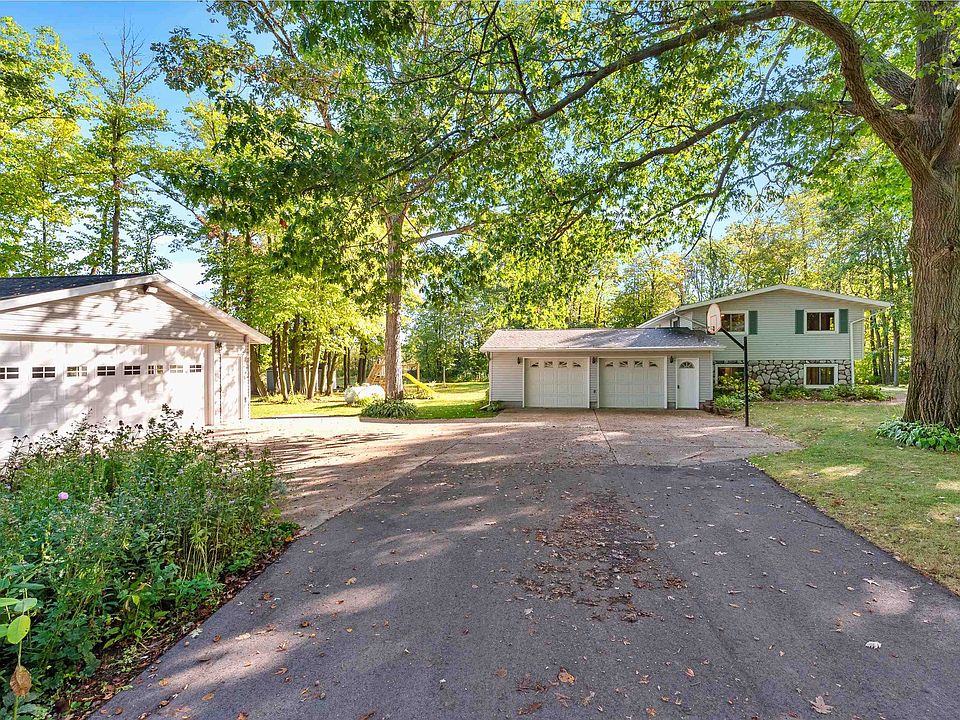 Delightfully updated raised ranch on edge of rural subdivision nestled on a parklike 1.59 acre mature treed setting with 4 car garaging and wonderful views of mother nature. Open concept floorplan with vaulted ceilings, tastefully remodeled center island kitchen, and eat-in dining to maintenance free deck. Offers updated bathrooms, lower entertainment level with exposed windows, and cozy gas fireplace. Includes garage lover's 30 x 24 attached 2.5 car heated garage, detached 2.5 car 24 x 30 heated garage and rear garden shed. Includes a brand new 2024 private sanitary mound system!