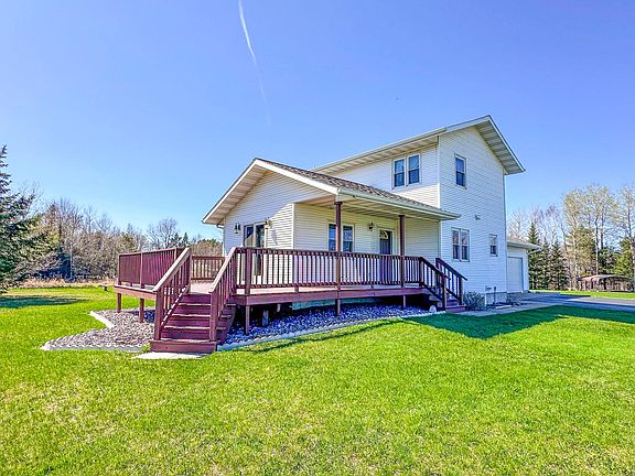 Charming & private 3BR, 1.5BA home on 20 acres w/multiple outbuildings & no visible neighbors, offering the perfect setup for hobby farming, homesteading, or simply enjoying the outdoors! The delightful home offers an open layout w/many windows, main level featuring living room w/gas stove & walkout to the backyard deck, inviting kitchen w/pantry, BR w/walk-in closet, & 1/2 bath. Full bath & 2 private BRs upstairs while the basement includes a large family room w/dry bar & utilities. Outside, you'll appreciate an impressive array of outbuildings: heated & insulated att 2-car garage, 48x30 garage w/workbenches, 28x24 shed/horse barn w/stall, gates & storage, and a sweet garden shed. Meticulous homeowner--some updates include modulating gas furnace w/air source heat pump, radon mitigation system, reverse osmosis drinking station & more. Room to roam, amazing sunrises, fiber internet, & proximity to town, lakes & public land—this is country living at its best! See MLS 211836 (less land)