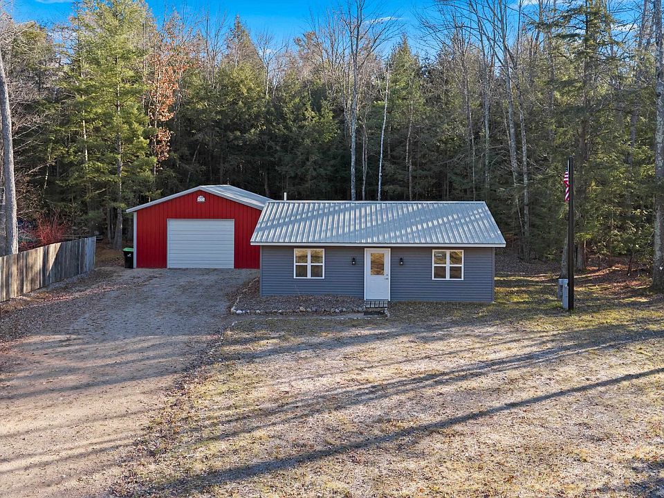 Welcome to N8658 Maple Beach Rd in the Town of Middle Inlet. Located just a short distance from Lake Noquebay, this property has it all! Right down the road is a public boat launch, beach, and docks for fishing. This property is perfect for use as a full time residence or as a cottage getaway. This home which was built in 2021 features vinyl siding, metal roof, open concept kitchen with an island, dining area, living room, first floor bedroom, and first floor bathroom (full). Features include a gas range, boiler system with radiant in-floor heating, electric fireplace, and water softener. The garage is 24' x 24' with a metal roof/siding, oversized garage door, and has electricty. On the property there is a 325 gallon propane tank (owned), 2000 gallon holding tank, and electric RV hookup.