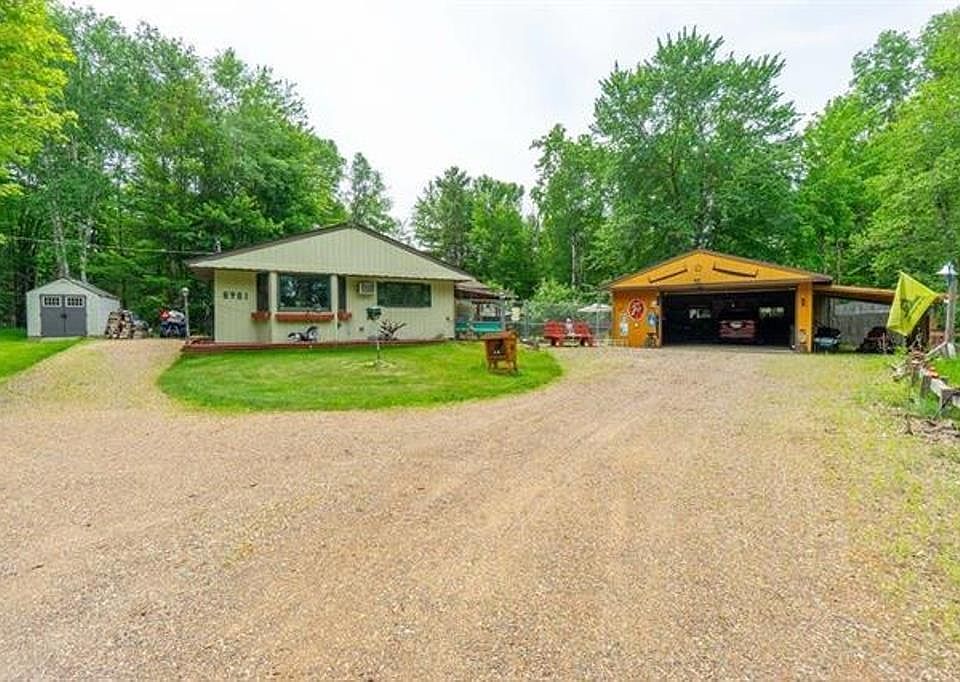Whether you're seeking a year-round residence or a weekend Northwoods retreat, this property offers the perfect blend of comfort and nature. Nestled on 1.5 private, wooded acres with 195 feet of frontage on Soo Lake (per seller). Soo Lake is a 601 acre full-rec lake known for great fishing and boundless fun to be had! this 3-bedroom, 1-bath home is a serene escape. Inside, you'll find two extra-large rooms perfect for entertaining or relaxing, along with a cozy wood-burning fireplace. Kitchen has a nice island that can be utilized for extra work space or dining. 2 extra large bedrooms, sized 11x23 and the third bedroom is average size making a perfect office or guest room. Step outside to enjoy the peaceful surroundings from your covered porch, fenced-in yard, 12x12 deck and an oversized two-car detached garage. Additional features include a chicken coop and plenty of space to create your own path down to a beautiful lakeside oasis. This is Northwoods living at its best!
