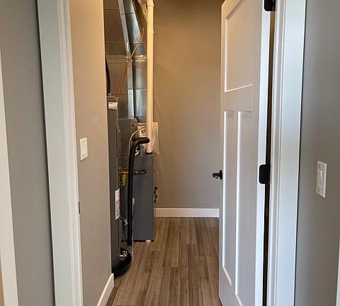 High-quality vinyl plank floor in living room, hallway, and bathrooms