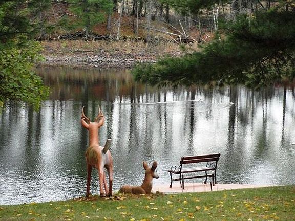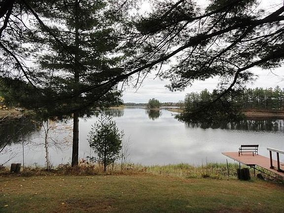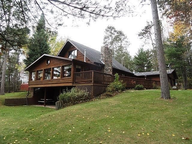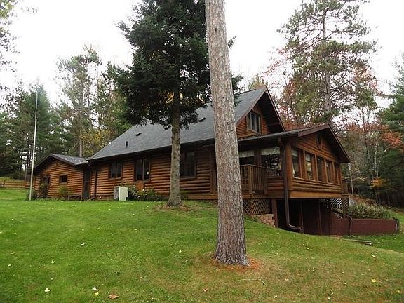 SPIRIT FLOWAGE FIND! Log sided home with finished lower walkout located at end of town road on a point with eastern & southern exposure on a 1+ acre wooded privacy lot. Main level:L-shaped kitchen-dining-living room, wood floors, stone fireplace, spacious sunroom, great water views, 1 bedroom, full bath w/walk in shower, & large hall closet. Upper level:2 bedrooms, bath w/walk in shower, wood floors and views of woods or water. Lower level: fully finished, laundry, bathroom w/walk in shower, food cellar, and nice daylight to the rec area with walls finished in barn wood. Large entry connects home to 24 x44 attached garage which is divided with half for parking and other half a finished & heated workshop. Other amenities:24x32 garage with concrete floor & electric AND 18x26 metal storage for boats, toys... PLUS 8x16 garden shed, circular blacktop drive, central air, & wood stove in the lower level. Easy access to Hwy 86 & only 5 minutes from town. Hard-to-find privacy on water as a home or get-away!