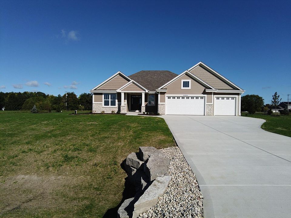 Move in Ready! Pinewood ranch home new construction. 3 bedroom/2full bath/3+ car garage. Fully cleaned/completed includes exterior concrete driveway and landscaping. Large open concept kitchen to living room with kitchen island. Master bedroom offers walk in closet, trey boxed ceiling private bathroom w double vanity sinks, ceramic tile shower, glass shower door. 9' poured concrete foundation wall which includes future lower level bathroom, high efficiency Armstrong furnace, 50 gallon water heater, iron curtain, water softener.