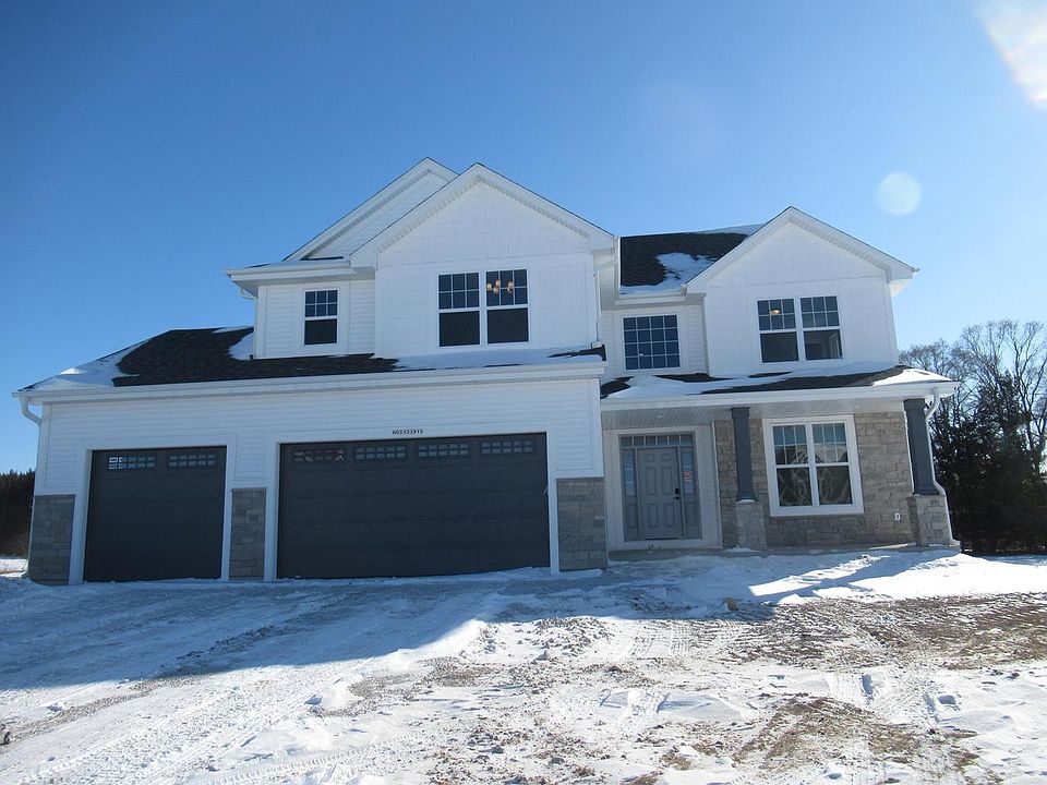 4 bedrooms/2.5 baths/flex room/partial exposure/2-story. Windows in exposure. Basement drain/vent rough-in for future full bath. Corner ceramic tiled walk-in shower/2 shower heads/double sinks/granite vanity tops in master bath. Double sinks family bath. 2 WIC's master suite. 9' first floor ceilings/pitched ceiling master bedroom. Knockdown drywall w/rounded corners. Kitchen cabinets are staggered w/cabinet crown moulding/granite or equivalent countertops/island/pantry closet. Mudroom w/drywall lockers & closet. 2nd. floor laundry room w/cabinets, sink, & closet. 3-car garage w/service door. Buyer added electrical pkg., water softener, iron curtain, kitchen island cabinet/countertop, zone heating, and upgraded living room flooring, fireplace stone & plumbing fixtures