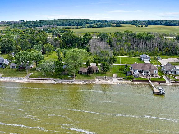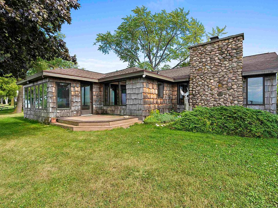 Rare waterfront opportunity on Green Bay! An exceptional and hard-to-find waterfront property offering approximately 160' (per public record) of pristine Green Bay frontage. The home is positioned on the far north side of the lot, leaving endless possibilities for the next owner to create their dream retreat. This charming 2 bedroom, 2 bath ranch includes a four seasons room with sweeping panoramic views of the Bay. The inviting living room boasts built-in bookshelves, while the family room features a stone wood-burning fireplace that flows seamlessly into the dining area. Additional highlights include solid surface counters in bathrooms, newer roof, storage shed, a concrete boat ramp, and a concrete retaining wall. (neighboring property to the south may have a slight encroachment)