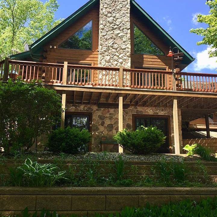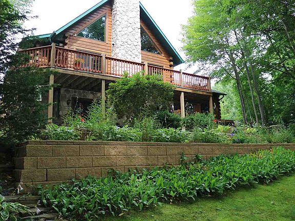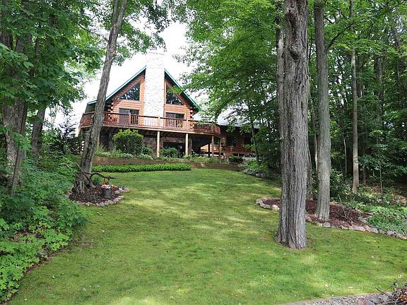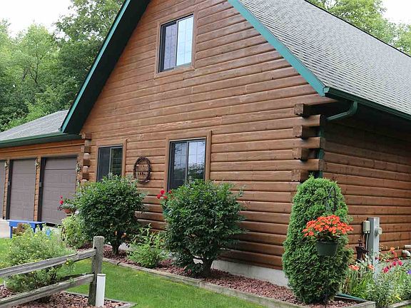 Own your own stunning piece of paradise! Amazing Golden Eagle Log Home on charming Kolpack Lake. Walk directly out the lower level, right down the gentle slope, to the waters edge. Beautifully landscaped with good sized garden and barn style garden shed. Cozy fire-pit with multiple entertainment and eating areas, all with breathtaking views! If you would like more bedrooms, there is plenty of space! Garage is drywalled with high garage doors.The first thing you notice inside this fantastic home, is the one of a kind stone fireplace, flanked by floor to ceiling windows, facing directly towards the lake. Bright, open living style, with kitchen boasting Dombeck Custom cabinetry. Wide plank wooden flooring throughout main level except for ceramic tile in kitchen and carpeting in bedrooms. 2 French doors lead outside to wrap around deck and additional entertaining spaces. Massive roof beams span cathedral ceilings. Main floor also houses spacious bedroom and full bathroom. Custom full log stairway draws you to open air loft with enough room for both bedroom and office space. Head downstairs to additional living space with 2 more french doors leading directly to covered patio and terraced gardens. Additional 750 sq ft unfinished space in lower level, now being used as a work room, but can easily be dry-walled for additional living space. Hook-ups outside for hot tub!