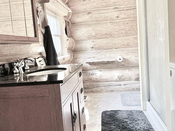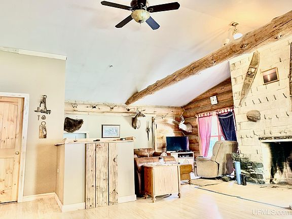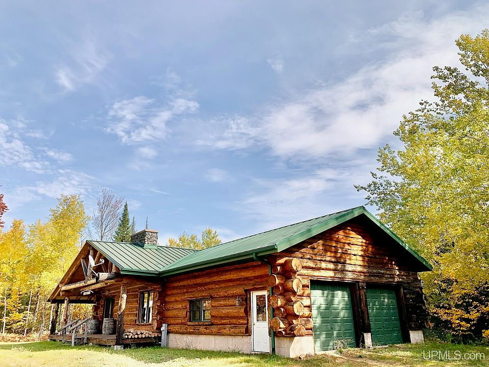Peace and tranquility is what you'll find here! Song birds in the morning, eagles, deer are plentiful, turkey grouse and an occasional bear. Wrap around covered deck to enjoy the scenery even on rainy days. Full log construction open concept, 2 bedrooms, 2 baths, walk-in closet, fireplace, walk out unfinished basement ready to be completed. ICF basement forms, metal roof, 8ftx8ft garage doors in heated attached 2+ garage. Heated hunting blind, creek, and wooded 40 acres. Near Norway Lake, Genes Pond and Pickeral Lake. Some finishing needing to be done. Source of heat is wood stove in basement.