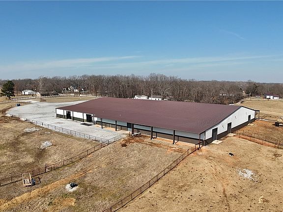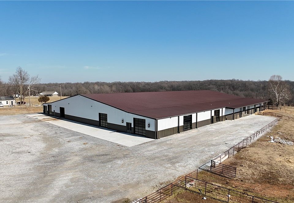 Exceptional equestrian property featuring a 41,250 SF enclosed horse arena situated on 25 acres of lush pastureland! Arena has a metal exterior, sand/dirt mix footing, LED lighting, fully insulated, commercial-grade ventilation, heating, and Big Ass Fans for year-round comfort & performance. Stunning glass overhead doors provide natural light & easy access. Interior amenities include trailer parking, a concrete-floored viewing area with drink ledge, unique “jailhouse” and ticket window, tack room, ample storage, & 6 Priefert horse stalls. On-site living quarters with HVAC offer convenience for owners or staff. The land is pipe fenced & enhanced by a spring-fed pond, natural spring, & frost-free hydrants & waterers in the field. A rare, turnkey facility ideal for training, events, or private equestrian use. Close to XNA airport & the new 612 highway!