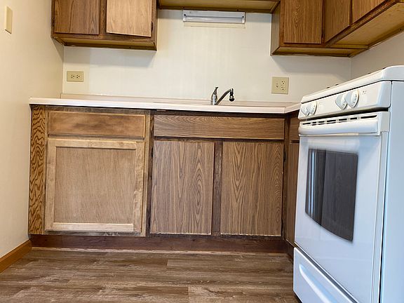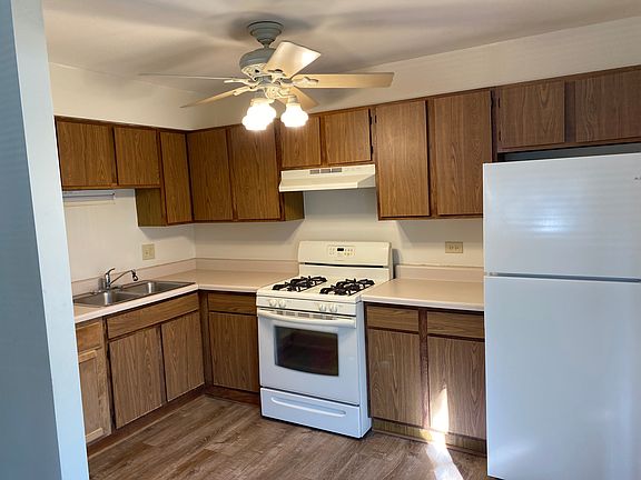 - Practical kitchen outfitted with wood cabinets, white appliances, a double-basin sink, and laminate flooring extending through the main living areas.