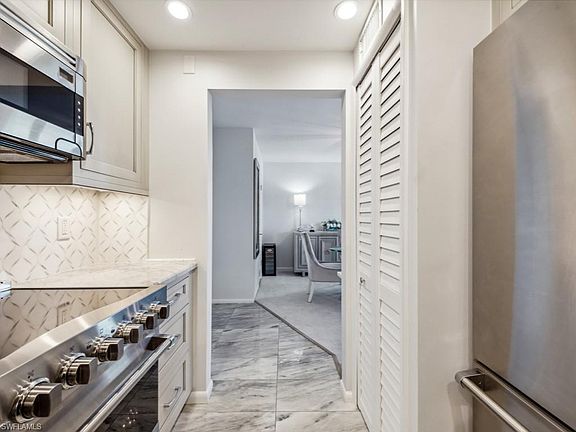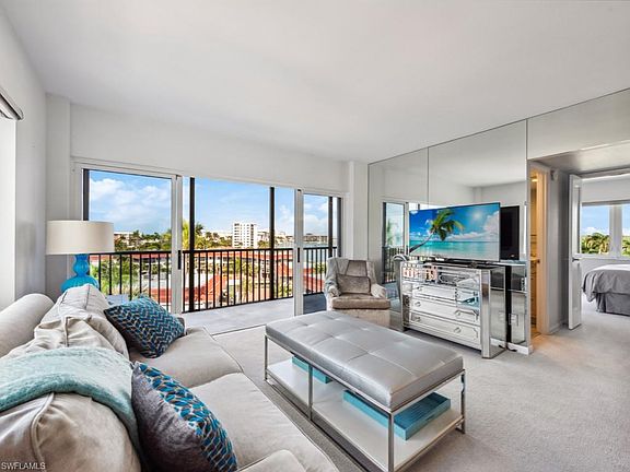 LOCATION, VIEWS, BEACH & BOATING! Just steps to Moorings Private Beach and minutes by boat to Doctor's Pass and the Gulf of Mexico, Beacon House is nestled in the heart of Naples' newly deemed "Miracle Mile" along Gulf Shore Blvd N. This light and bright 1 bedroom / 1 bath end unit boasts a high-end renovation including Viking appliances, custom cabinets, quartz countertops, custom mirrors and extreme attention to detail. Luxury furnishings also convey. Enjoy sunset and sunrise from the screened lanai which runs the entire length of unit and Gulf or Bay views from every living area! The Beacon House compound features newly painted buildings, a beautiful bayside swimming pool, gas grilling and dining areas. Construction is almost complete on the first floor amenity levels to include designer Marina "party" Rooms, lobbies and two Guest Suites for your overflow visitors. An income producing Marina offers Owners slips for lease up to 40' and the perfect Doctor's pass location with NO bridges to the Gulf. Kayak & SUP launch, deeded covered parking, owners storage and more!