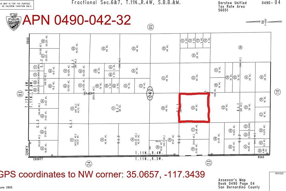 40 Acres (APN: 0490-042-32) GPS: 35.06203, -117.34388 This 40 acre property sits north west of Harper Dry Lake in the Lockhart area of Hinkley, CA. This property lies within the unincorporated area of the San Bernardino County within the 'Resource Conservation (RC)' zoning. According to the County this land use designation zoning district provides for open space and recreational activities and single family homes. Some of the other permitted uses include; crop production, orchard, vineyard, produce stand and a licensed residential care facility. Owner will finance with a minimum of 20% down. Submit your offer and terms for consideration. Harper Dry Lake, located in Hinkley, California, is a unique geological feature known for its expansive, flat salt surface. The lake bed, once a prehistoric body of water, has long since dried up, leaving behind a vast expanse of white, crystalline salt deposits that shimmer in the sunlight. This picturesque and otherworldly landscape has attracted the attention of photographers, filmmakers, and nature enthusiasts alike, drawn to its surreal and desolate beauty. The history of Harper Dry Lake is intertwined with the surrounding Mojave Desert and has been a backdrop for various cultural and environmental studies.