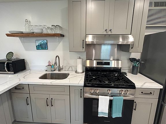 Custom cabinetryGas stoveQuartz countertopsNew appliancesFull kitchen