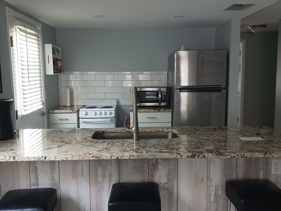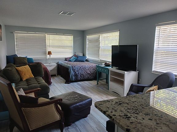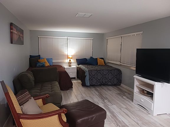Newly remodeled, fully furnished VACATION rental. Month to month. 1 bedroom apartment. Set up hotel style with 2 double beds in large living area and 1 king bed in bedroom. A family of 4 will sleep comfortably. 1 month or more rentals. Walking distance to New Port Richey's beautiful downtown, public park and fishing. 5 minute walk to downtown, parks, grocery, beauty, shops, etc. 2 minute walk to public transportation. 25 minutes to Clearwater, 20 minutes to Tarpon Springs Sponge docks, 45 minutes to Busch gardens, 2 hours to Disney, 2 hours to Daytona. Caretaker on site. No smoking. No pets. Evening appointments.