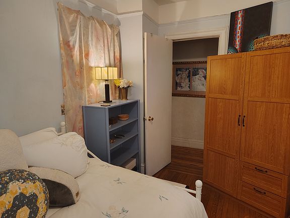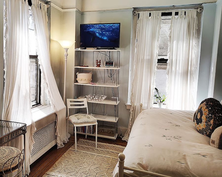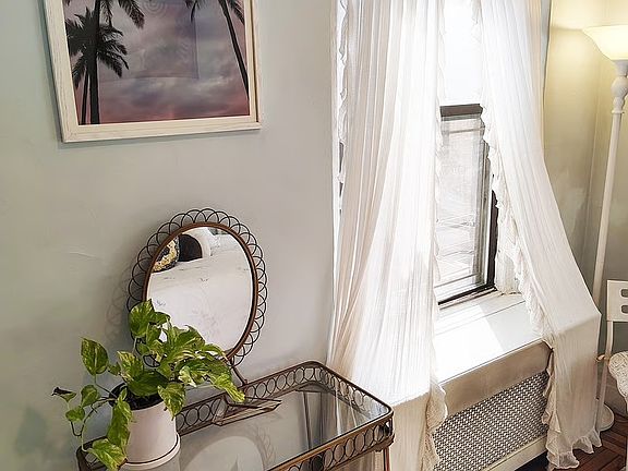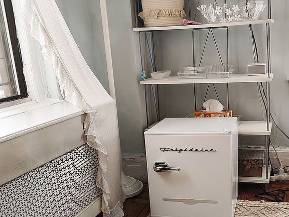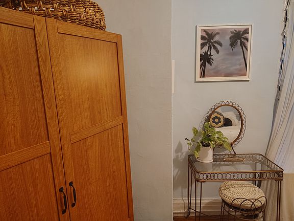 The room is a freshly painted space with brand-new furniture and plenty of natural light. The room has a full-size bed, plenty of storage space including an armoire with a built in closet, and an innovative layout with a vanity that works as a desk. Utilities included. There's also a smart TV, Frigidaire mini-fridge exclusively for the renter's use, double-sided bookcases for nightstands, a bench with storage baskets, and a full-length mirror. Two large windows bring in remarkable light during the day, and updated furnishings give the space a clean and fresh vibe.