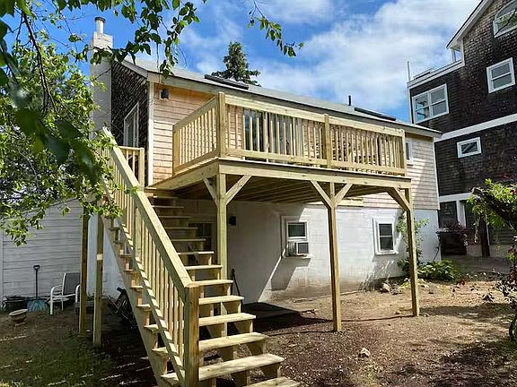 The cottage features a cozy living area, king bedroom, updated bathroom, and private deck with outdoor seating. Off-street parking is included. Pets are welcome with approval.