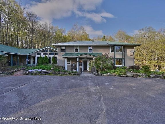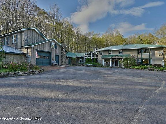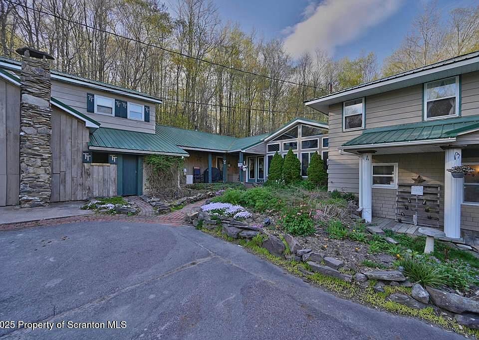 Welcome to your own private oasis. Two homes on over 2.57 acres connected by a lovely year round room with windows on both sides to take in the views. Current owners are in-laws and have appreciated the closeness yet privacy this home has offered them. In the past, has also been used as an Airbnb and Retreat Center.You will feel the charm from the moment you step on the new trex deck to the first home.  A foyer/mudroom greets you with wood floors, ceiling beams, kitchen, dining room and a large living room. 4 beds, 2 baths, including a master suite with a bathroom and sitting room, and a laundry room complete the second floor.The second house features an open family area with a recently remodeled kitchen and dining area. Take the stairs up to the second floor where you will find 5 beds, 2 baths and a den/sitting room. Both homes have a rustic feel with some modern upgrades and touches. Once you have fallen in love with the inside, head outside to the back decks , pavilion and walking trails. This property boasts serenity, privacy and the natural beauty that surrounds it. Less than 2 hours away from NY and Philly and 25 minutes from Camelback, Elk and Kalahari.