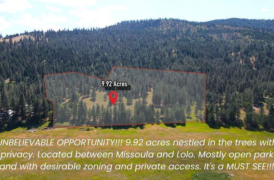 UNBELIEVABLE HIDDEN GEM!!! 9.92 acres nestled park in the trees with privacy. Located between Missoula and Lolo. Mostly open park land with desirable zoning and private access. It's a MUST SEE!!!