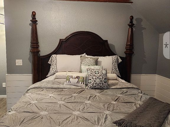 The apartment features a comfortable California King-sized bed, a closet, a TV, and a pull-out /trundle for additional sleeping arrangements (2 child size). The bathroom includes a shower for your convenience. Indoor amenities include high ceilings, creating a spacious and airy atmosphere. The living room has a loveseat, oversized chair, TV, and an electric fireplace, providing comfort and entertainment options.