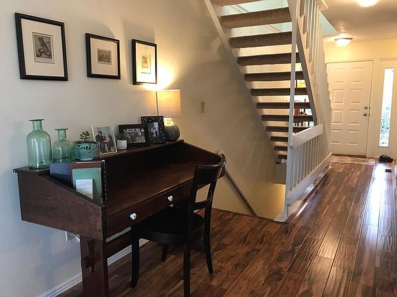 Tastefully redone main and master baths, fresh paint and carpet throughout, as well as handsome wood floors. Three bedrooms; One on top floor along with the master, each with outdoor decks, and one large private bedroom in the basement, all bedrooms with large closet space, or huge rec/tv/play room in the basement, as well as a storage and laundry room with washer/dryer. Full house air-conditioner and blinds in every room. One car garage with ample storage, plus convenient parking.