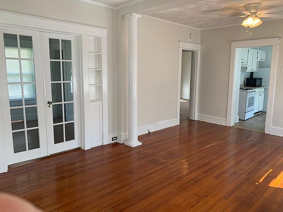 Large living room with hard wood floors on corner lot with private two car driveway.