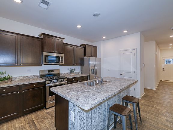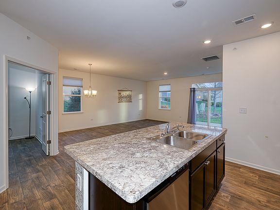 Fantastic end-unit ranch townhome with 2 beds plus den and 2 full baths in sought-after Lincoln Valley. Built in 2020, this Galway model is the largest of the triplexes offering 1,413 square feet of beautifully designed space filled with natural light. The kitchen, living room, and dining area flow seamlessly together, creating an inviting and spacious layout perfect for entertaining or relaxing at home. The kitchen features a large island with seating, designer cabinets with crown molding, a pantry, and stainless steel appliances. The primary suite includes a huge walk-in closet and private bath with a stand-up seated shower, linen closet, and raised vanity. The den with double doors provides a versatile space for an office or guest room. Additional features include a two-car garage and smart home technology for modern comfort and convenience. Enjoy resort-style living in Lincoln Valley's clubhouse community, offering a health club, pool, bocce ball and pickleball courts, and scenic walking trails. Ideally located across from the Red Oak Nature Center and Fox River Trail, this home combines nature, community, and low-maintenance living.