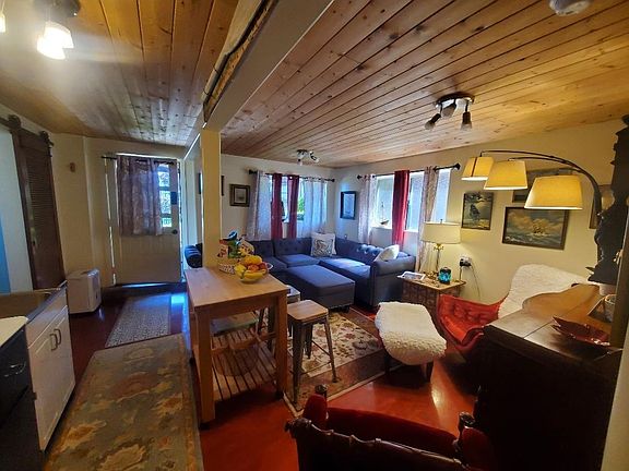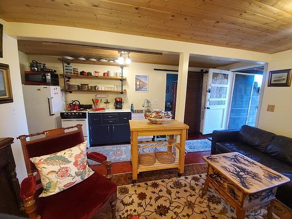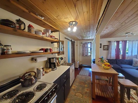 Private and petite apartment in a historic multi-family apartment building located downtown. A long, comfortable sectional is paired with a vintage red velvet chair fit for a Captain or one of the crew. There is a sturdy rolling island between the living area and the kitchen. Make it your work-away-from-work remote office station, or extra counter space for meal prep. With an open floor plan and modern shelving in the well-stocked kitchen, the Grotto boasts a full size refrigerator, microwave, and an apartment-size stove with an oven, among many other kitchen tools and appliances, for even the more accomplished chefs and foodies.