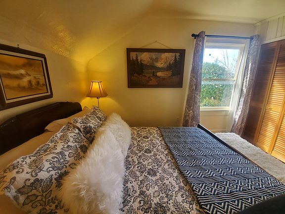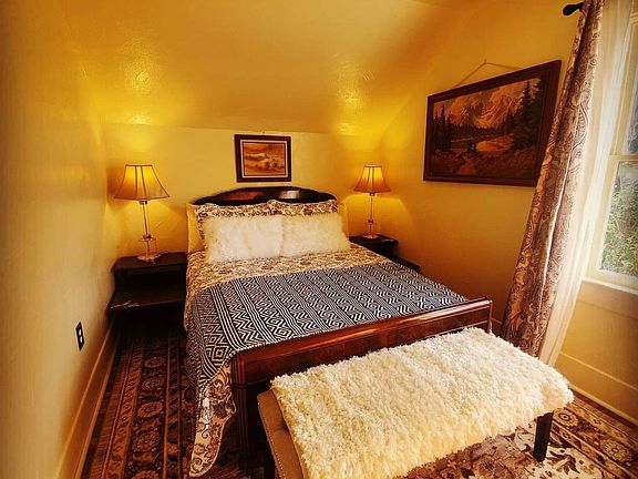 Through the private curtain partition of the cozy bedroom is found the antique bed with queen memory foam mattress, soft linens with fluffy pillows, blankets, and a decadent duvet.