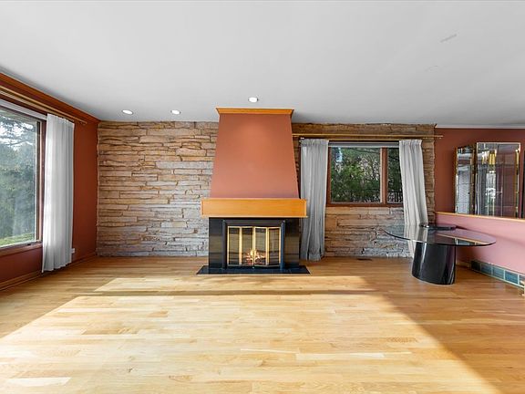Wonderful stone fireplaceIn-ground swimming poolCharming cabanaLarge dining roomWet barSerene yardMid-century tri-level layout