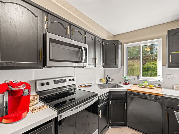 Welcome home to this immaculate and newly renovated two-bedroom in the sought-after Ledgebrook community. Step inside to a spacious living room with a large hearth stone fireplace, perfect for cozy evenings, and an open dining area ideal for everyday meals or entertaining. The easy ranch layout means just a few steps to enter, with a private wooded back deck- fully covered-for year-round enjoyment and lake view. Updates give peace of mind, including all new windows and slider, new flooring, remodeled bathroom with medicine cabinet, new appliances (refrigerator, microwave, and stove), built in butcher block, fresh window treatments, and updated electrical with fire alarm/carbon monoxide system. The home has been freshly painted with updated baseboards, plus a security system and private locked storage unit. Residents of Ledgebrook enjoy resort-style living with a sparkling pool, relaxing spa, fitness center, and library. Stroll the beautifully landscaped grounds along a scenic walking path that winds around an aerated lake with a picturesque bridge and pond with fountain, creating the perfect setting for both relaxation and recreation. Conveniently close to 1-95 Metro North, and fabulous shopping, this home blends comfort, style, and convenience in one inviting package. storage unit (pictured) is below unit. Access granted with offer, rules and regs prohibit visitors. Water sensors connected to security system - 1 under kitchen sink and 1 by hot water heater