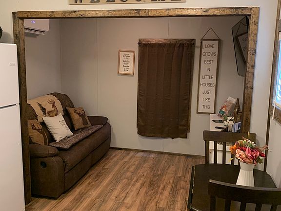 Check out this comfortable and cozy tiny house! With 432 square feet this would make the perfect camp to move to the lake! This home would also be a great fit for anyone wanting to downsize, it's so economical and sustainable. The kitchen features a full-size refrigerator, stove and new water heater that's custom size built for tiny homes. Bedroom, bathroom, kitchen and living area, it's so COZY! Very sturdy structure with all walls, roof and flooring in excellent condition! Barnwood accents on the ceiling beams and chair rail, antiqued tin on the walls for accents, which gives it so much character! Luxury vinyl plank flooring throughout that makes it easy to clean! The home has a brand new split unit air conditioner/heater that is still under warranty. Brand new skirting was recently purchased and installed. 8ft x 24ft porch is just perfect to fit and truly makes this house into a home! Ready to be MOVED to your property and start your tiny home living! It's definitely a must see! Call me soon! HOME MUST BE MOVED! LISTING IS FOR THE TINY HOUSE ONLY, not the property.