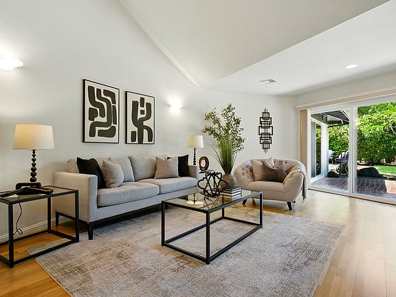Large windows and glass patio doors fill the living and dining areas with natural light, opening to a private, landscaped backyard ideal for entertaining or unwinding. The primary suite features direct patio access and a private bath, while two additional bedrooms share a Jack & Jill bathroom.