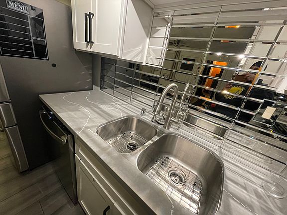 Contemporary Kitchen stainless steel refrigerator, dishwasher, and mirrored backsplash for a sleek touch.