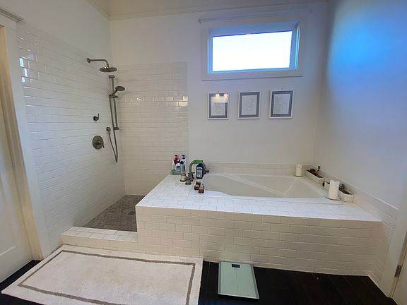 Private entranceMature plum treeMarble countertopsTons of natural lightSeparate walk-in showerLarge back deckSoaking tub