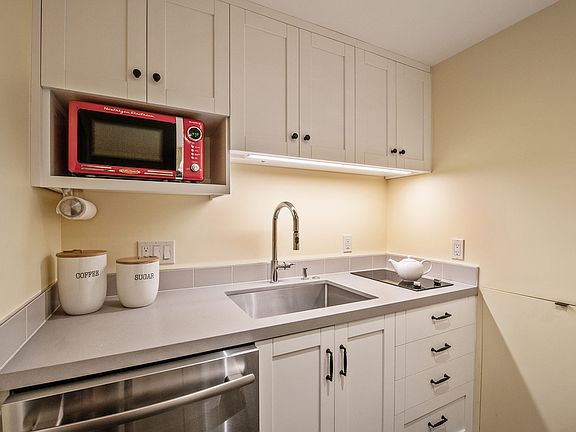 - Kitchenette with microwave, sink, stainless steel small refrigerator and electric stovetop double burner.