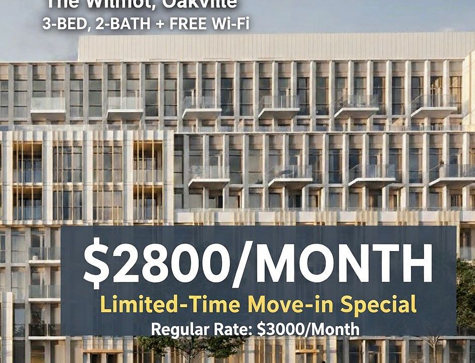 Brand new, luxurious 3-bedroom, 2-bathroom ground floor condo with 1 parking spot and FREE Wi-Fi at The Wilmot in Oakville (Dundas St E & 8th Line). This spacious unit is over 900 sq. ft. and features a private terrace, modern stainless steel appliances, and in-unit laundry. The smart-technology building offers exceptional amenities, including a 24-hour Concierge, Gym, Yoga Studio, Rooftop Deck, and Pet Spa. Enjoy easy access to the 403, QEW, GO Transit, and all local shops, hospital, schools and parks.