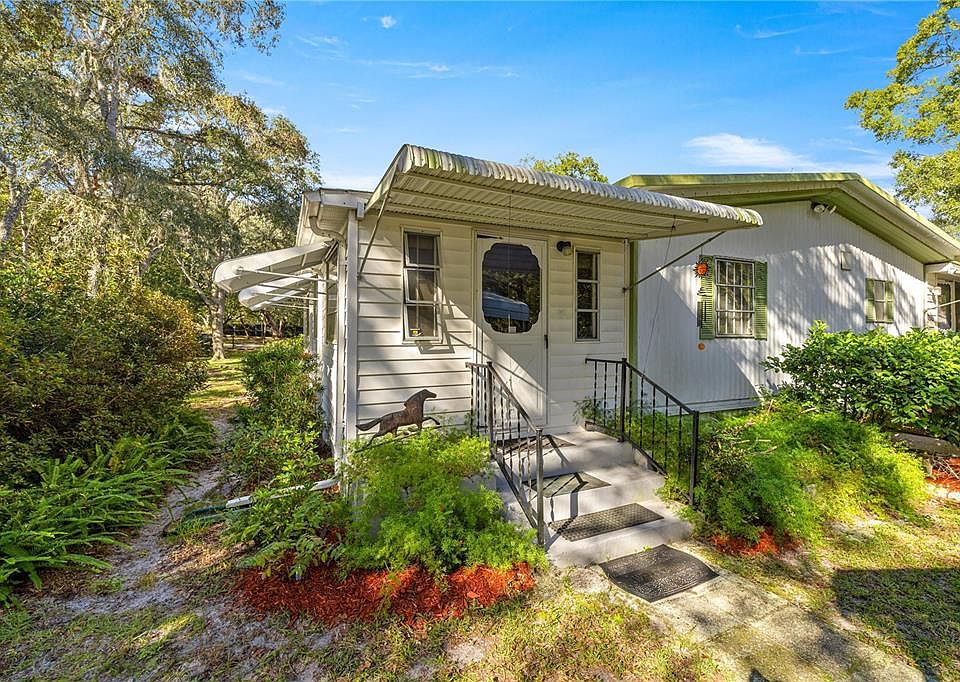 INVESTMENT OPPORTUNITY. Versatile 5-bedroom, 3-bath property on a corner lot just 5 minutes from the World Equestrian Center! The main home offers 3 bedrooms, 2 baths, luxury vinyl flooring, carpeted bedrooms, and a 14x9 screened room currently used as an artist studio. Across the property sits a fully furnished 12x35 tiny home with 2 bedrooms, 1 bath, and a loft, plus its own driveway, fenced yard, and covered porch—perfect for guests, in-laws, or rental income. Additional features include a 10x20 powered shop with an 8x13 screened porch, an extra storage shed, and plenty of outdoor space for parking or projects. A unique opportunity close to Ocala’s top equestrian venues, shopping, and dining—ready for your vision!
