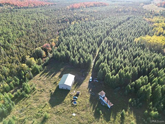 240 Acres with Legal, Insurable Access via private road easement. There is a 36x48 Pole Barn with cement floor and a 14 foot high garage door to store your toys or convert to an off-grid Camp or home. There is also a " Vaulted Privy" ( Septic/Tank with no outlet) 4-5 years old. Three blinds set up and ready for hunting season. Very secluded at the end of the road, adjoining Thousands of Acres of State Of Michigan land to the East and CFA Lands to the West to roam for miles. The Snowmobile trail is accessible directly from the parcel, as well as miles of ATV trails to use from your property. The Seller has enjoyed many years of Successful Hunting adventures and fills his Tag here year after year. There are plenty of Black Bears in the area as well as turkeys, and upland birds.